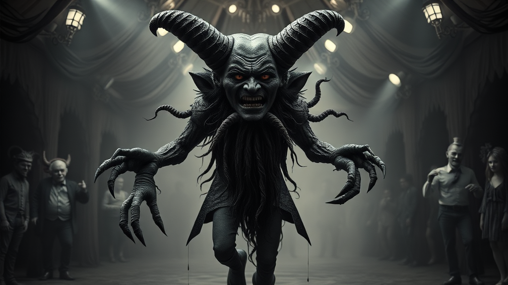 A devilishly sinister and mad master showman leads a grotesque dark circus, exuding a horror-filled allure with intricate designs and dramatic lighting. This photorealistic and cinematic scene captures two-faced entities melded into one surreal figure. They boast exaggerated features: a large head with a long, twisted beard and pointed shoes accentuating every step. Their appearance is a chaotic blend of disfigured, mutated forms with fused fingers and malformed anatomy, lending an eerie, otherworldly vibe. Blurred outlines and monochromatic tones add a timeless, old photo quality. The showman's eyes are shadowed and brooding, while ink-like liquid elements drip from their limbs, merging with the circus's dark atmosphere. Their presence is otherworldly, with illogical proportions, creating a mesmerizing yet unsettling spectacle reminiscent of a distorted carnival dream. The fusion of reality and fantasy manifests in a captivating, nightmarish display of the bizarre and unreal.