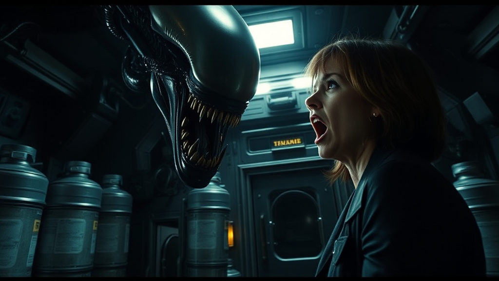A high-resolution, cinematic scene reminiscent of Ridley Scott's iconic style, featuring an intense confrontation between an imposing alien and a terrified Ellen Ripley, portrayed by Sigourney Weaver. Ripley's face is frozen in a scream of fear as she attempts to escape the alien's looming presence. The background is filled with intricate spacecraft equipment, including oxygen tanks, creating an atmosphere of tension and claustrophobia. The dark, moody lighting casts deep shadows in a dimly lit room, enhancing the sense of impending danger. The shot captures a wide angle, imbuing the image with a raw, immersive quality typical of a Sony ALPHA 7R V's film look. The cinematic light gives the scene an atmospheric depth, evoking the suspenseful essence of a sci-fi thriller.