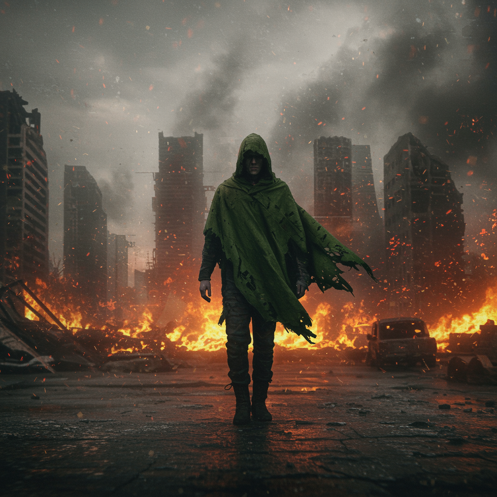 A man in a tattered green cloak walks forward with determination, a city engulfed in flames behind him. The ruins of buildings crumble in the apocalyptic backdrop, yet he strides confidently towards the viewer. The scene has a surreal, dreamlike quality with artifacts and a low-resolution, monochrome blur. His eyes are obscured, creating an enigmatic aura. The composition is marked by distortion and asymmetry, with proportions that seem slightly skewed, evoking a sense of haunting decay. The image carries an air of mystery and the decay of civilization.