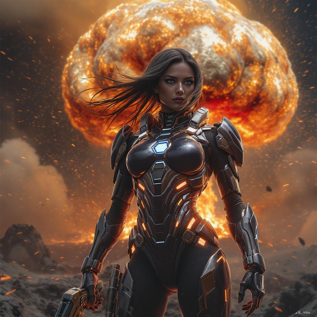A highly detailed portrait of a young woman in a futuristic exo suit with intricate sci-fi armor, set against a dramatic backdrop of a nuclear explosion. The scene captures the intense moment of a blast wave sweeping through, with particles of nuclear ash suspended in the air. The brilliance of atomic fission creates a stunning display of complex lighting, enhancing the cinematic staging of the composition. Her full-body pose exudes strength and resilience, encapsulated in a hyper-realistic, 8K UHD image that resembles a still from a high-budget science fiction movie. The atmosphere is intensified by the flash of light and sense of speed, captured with long exposure techniques to give a sense of acceleration. The scene is designed with photorealism, achieving an awe-inspiring, cinematic quality in its futuristic style, maintaining the original core elements while incorporating subtle creative variations.