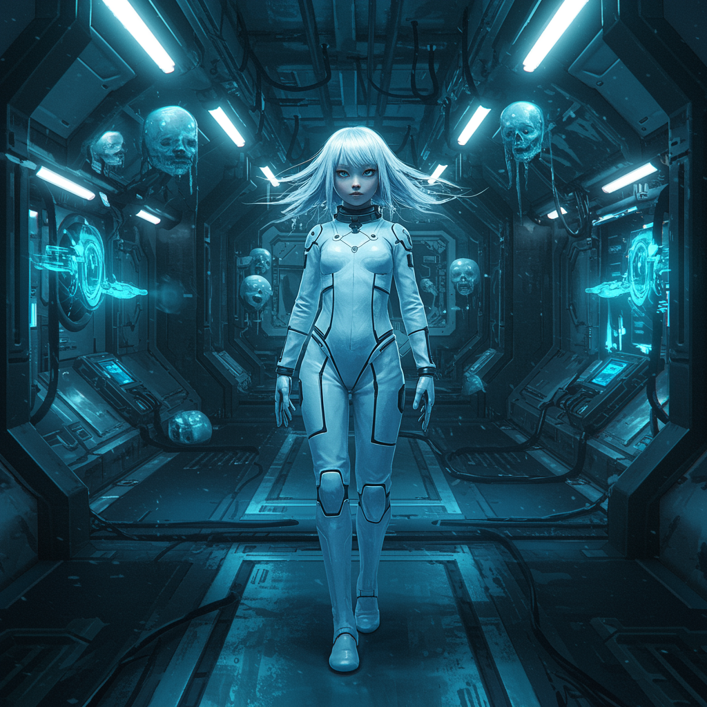 Inspired by Tsutomu Nihei's futuristic style, envision a young girl in a sleek, form-fitting white sci-fi jumpsuit. Her striking, slightly rebellious hair captures the essence of cyberpunk, with elements that seem to defy gravity and flutter in a stark, cold room aboard a sci-fi spaceship. Her expression is icy, matching the muted tones of her surroundings, where blue lumen and sharp angles intersect with bright light from one side. The space is vast, with multi-storey levels creating sharp shadows and a blurred backdrop. The atmosphere is detailed and futuristic, filled with intricate designs and energy pulses, suggesting a third-person perspective. Round features and elements are present, casting varying degrees of illumination. There's a sense of introspection amidst the high detail, as her form seems untouched by imperfection, contrasting with ghostly, mutated forms, floating limbs, and defying proportions that sometimes occupy this world. Distorted, disfigured impressions loom like shadows, creating a haunting blend of beauty and the grotesque, stirred by deformed forms and the ethereal glow of lifeless eyes.