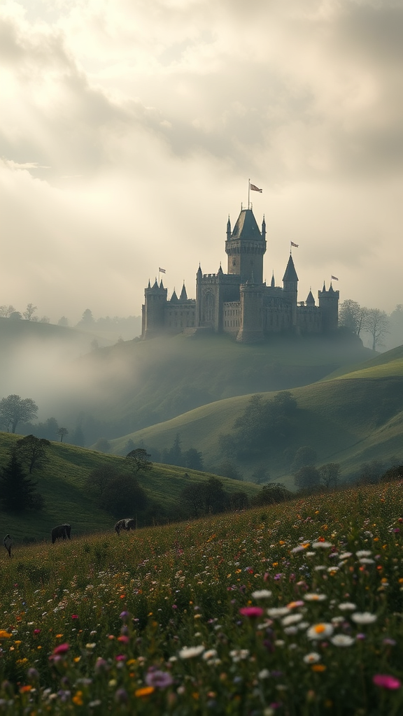 Medieval countryside with a majestic English castle nestled in the distance, enveloped in morning mist, atmospheric and hyper-realistic, showcasing rolling hills and fields of wildflowers, 8k resolution, epic composition with dramatic lighting, cinematic ambiance, rendered in octane, capturing the essence of traditional landscape photography by Carr Clifton with a touch of fantasy elements such as mythical creatures softly blurred in the background.