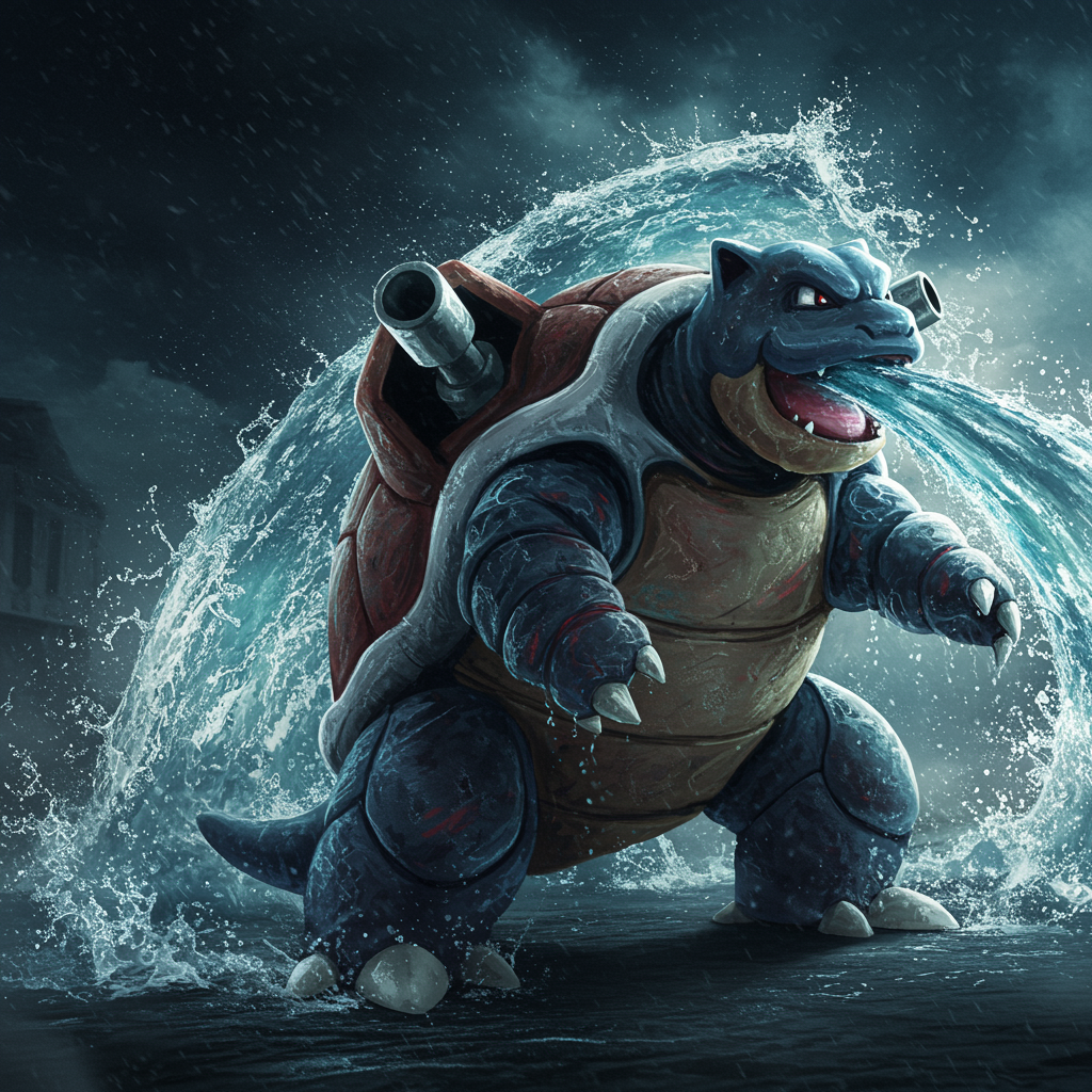Envision a formidable dark Pokémon Blastoise, an imposing large monster turtle unleashing a torrent of water with immense power. Its form is drenched and twisted, embodying a macabre presence with intricate details. The scene is infused with dramatic lighting, enhancing the hyperrealism and photorealistic qualities of the creature. The setting mirrors a cinematic experience in ultra-high definition, capturing the intense and dynamic moment in 8k resolution, presenting in an aspect ratio of 9:16. Its shell and features are rendered with an intricate design, drawing you into a haunting and awe-inspiring visual spectacle.