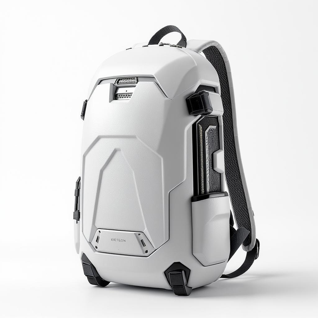 Sleek capsule-shaped white hardcase backpack with urban stormtrooper aesthetics, featuring minimalist and modern design elements, intricate textures, and high-resolution 4K rendering; inspired by Dieter Rams and Apple's design philosophy, offering a seamless blend of functionality and style against a pristine white background.