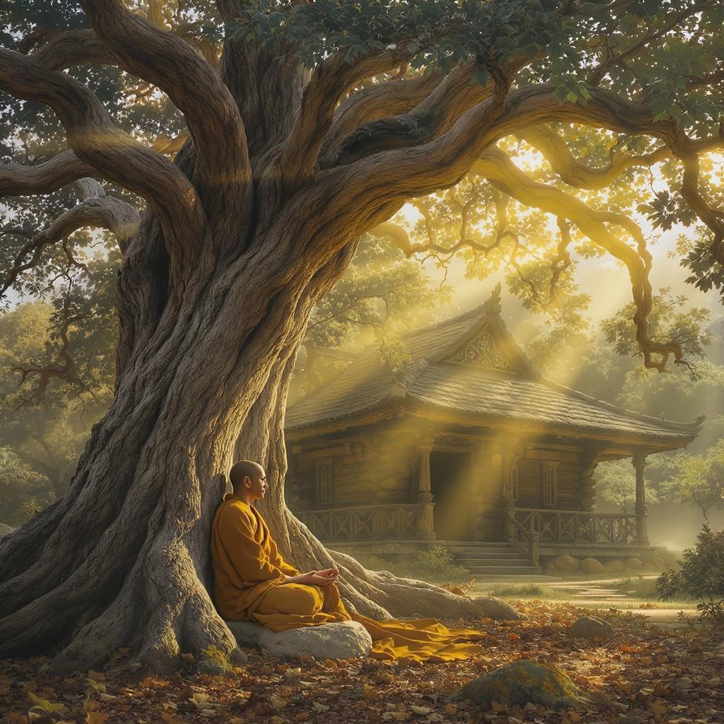 A serene scene unfolds with a close-up view of a monk deep in meditation beneath the sprawling branches of an ancient tree. The retreat cabin in the background is a marvel of age-old architecture, its wooden beams intricately carved with mystical symbols. Enveloped in a soft, holy light, the setting is bathed in golden sunlight that filters through the leaves, casting a warm, mythical glow over the tranquil landscape. The air is filled with a sense of peace and timeless wisdom, as nature and spirituality harmoniously converge in this sacred space.