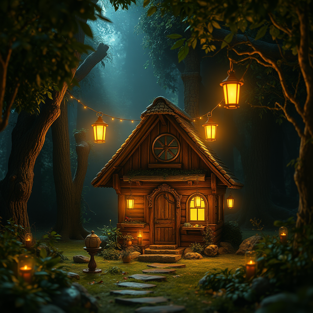 In a fairy tale wonderland, an enchanting landscape of mystical beauty unfolds, where nature's wonders are woven into every corner of the scene. At its heart, a small, magical wooden house stands, nestled amidst a dark, mysterious forest. The house is ingeniously crafted with intricate details, its rich textures illuminated warmly from within, casting a soft, inviting glow into the night. Lanterns hang symmetrically, their gentle light flickering in harmony with the rustling leaves, adding to the house's magical allure. The entire scene is bathed in an ethereal bloom, with light rays piercing through the dense canopy, creating an atmospheric spectacle of photorealism and cinematic allure. Shadows play delicately, thanks to the ambient occlusion, enhancing the depth and allure of this harmonious vision. The environment feels alive, whispering ancient secrets, as it encapsulates an incredible, breathtaking beauty, inviting all to marvel at this serene yet wondrous realm.