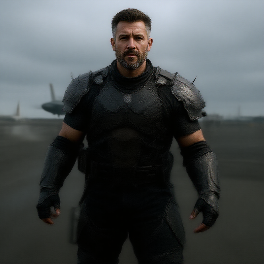 Ultrarealistic portrait photograph showcasing the full body of a 28-year-old Israeli Caucasian male, characterized by a dominant and muscular physique, with a hairy chest and slightly smaller head. His shiny hair complements the scene, set in a wide field of view. The subject is depicted in a sci-fi setting at a spaceport, with a futuristic spaceship taking off in the overcast background. He is wearing intricately detailed plate leather armor, highlighting each contour with natural textures. The scene is cinematic, utilizing moody and natural lighting, with a hint of volumetric light adding depth. The action pose captures a moment of intensity, rendered with hyper-realistic and vibrant detail, akin to a movie style. The image, treated with ultra-HD, 8K quality, and photorealistic techniques, ensures every element from natural blur to ray tracing contributes to its high detail and lifelike appearance. Despite its complexity, it avoids any visual distortion or artifacts, maintaining fidelity to the essence of a cinematic, dynamic, and immersive portrait.