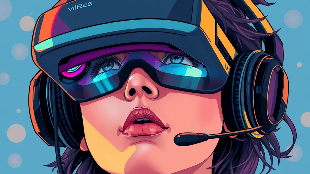 A detailed illustration of an individual immersed in a virtual reality experience, wearing a high-tech VR headset and sleek headphones. The art style is inspired by Victor Mosquera, showcasing a neo-dada influence with vibrant vaporwave cartoon aesthetics. The hyperrealistic scene captures intricate details and vivid colors, blending elements of vector art with a futuristic vibe. The person's expression reveals a sense of wonder and curiosity, highlighting the allure of the digital realm.