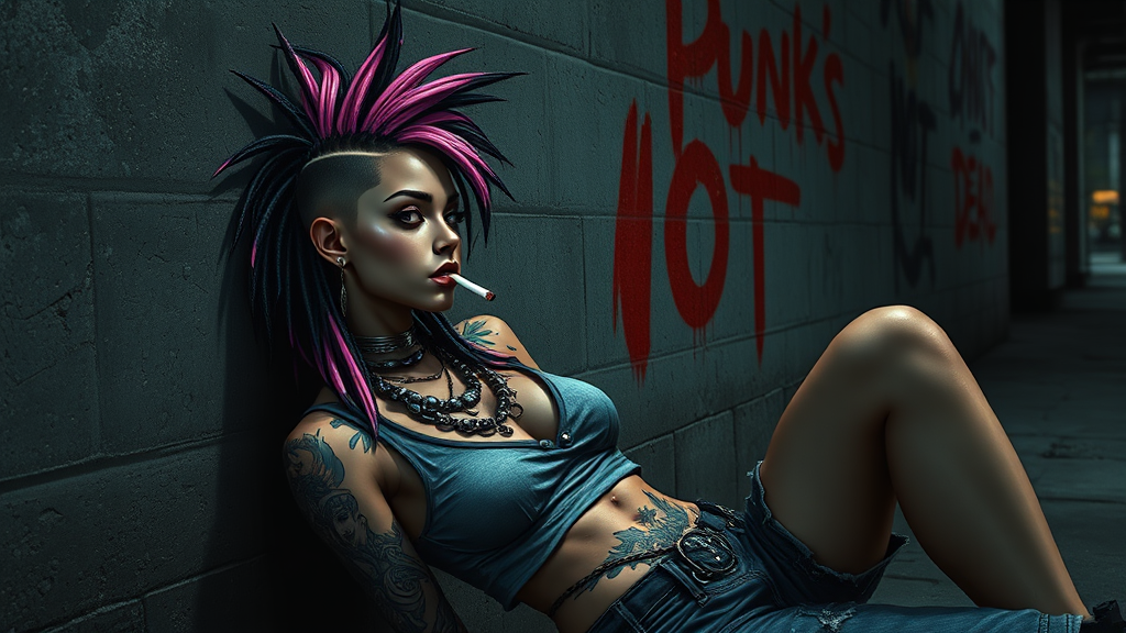 A slender punk female reclines against the wall of a dimly lit alley, savoring a short cigarette. The wall behind her is spray-painted with the bold red phrase, "Punk's Not Dead." Her hyper-realistic, intricately detailed dreads feature a striking pink and black color scheme, partially shaved on one side into a side mohawk haircut. Adorned with large necklaces, her body is covered in vivid tattoos showcased by her worn and torn crop tank top. Facial piercings add an edgy touch to her nose, lip, and eyebrow. Her clothing is visibly dirty and tattered, contributing to her rebellious aura. The setting is enveloped in a wide, dark background reminiscent of Luis Royo's illustrations, enhanced by Rembrandt lighting that casts a dramatic contrast. The scene is depicted with hyper-detailed intricacy and sharp focus, resulting in a masterpiece of fantasy concept art.