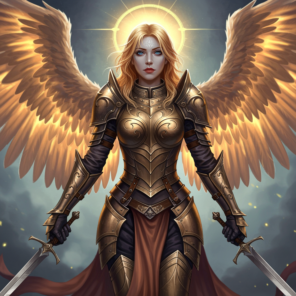 Ethereal female warrior archangel, hauntingly beautiful, cascading golden blonde hair, porcelain skin, piercing sapphire blue eyes, perfectly symmetrical and delicate facial features, slender and refined figure, aura of divine grace, armored wings that glimmer with heavenly light, intricate celestial designs on elegant bronze plate armor accented with gleaming silver pauldrons, fantasy D&D setting, dynamic and poised stance, full body portrayal, hyper-realistic with mesmerizing fine details, cinematic presence, 8k resolution, ultra-detailed craftsmanship, evocative and striking atmosphere, capturing the essence of angelic majesty and strength.