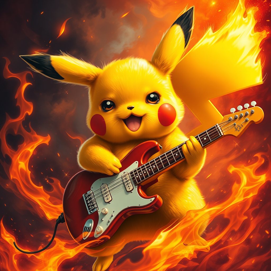 Hyper-realistic style of Pikachu amidst swirling flames, strumming an electric guitar with fierce intensity, sparks flying in harmony with the fiery background, its fur reflecting the vibrant hues of orange and red.