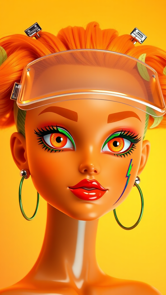Create a vividly stylized 3D floating head of a tangy-punk vinyl doll. The face sports a warm caramel-tone plastic-gloss vinyl finish with a strong mirror bounce on the temples and chin. The eyes feature zesty-orange irises with playful lemon-slice pupils, accented by bold lime-green winged eyeliner. Hair is styled into twin voluminous mandarin-fuzz puffs, with a subtle glimpse of a neon-green shaved undercut below. Lips are coated with a luscious blood-orange lacquer, exhibiting an ultra-wet shine. Accessories include a clear acrylic visor with sleek chrome citrus-leaf clips and three oversized neon-green resin hoops. A pixel-art lightning bolt tattoo sits beneath the right eye. The background transitions smoothly from mango-yellow to pastel-peach, bathed in bright beauty lighting that casts a warm glow, punctuated by crisp highlights on the doll’s glossy skin. The camera captures the scene in an 85 mm portrait crop, emphasizing textures like the plush fuzz hair, vinyl-shine skin, glassy lips, and resin hoops, all embodying an acid-fruit punk doll style.
