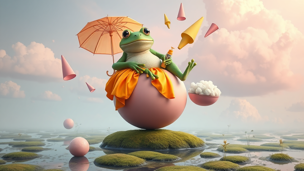 In a whimsical, dreamlike scene, a large, green anthropomorphic frog with a serene expression lounges atop a pink sphere adorned with a silky orange drape. Clutching a vibrant yellow umbrella in one hand and a diminutive spray bottle in the other, the frog is encircled by an array of floating, abstract shapes. Among them, pink and yellow conical forms glide gracefully, alongside a bowl overflowing with fluffy, cloud-like material. The background is a canvas of pastel hues, where soft pink and blue clouds drift lazily in an ethereal sky. Below, the ground is a tapestry of swampy, moss-covered earth, dotted with floating patches of vegetation and delicate plants. The scene bathes in a gentle, surreal light, exuding a playful and fantastical atmosphere that enchants the imagination.