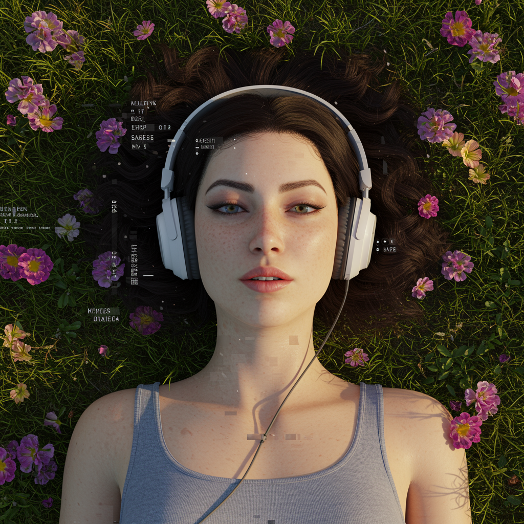 A woman is lying on a lush field of vibrant flowers, her head adorned with headphones. Her face is symmetrically detailed and intricately rendered, capturing a realistic and cinematic essence. The image is highly detailed, yet subtly features low-resolution elements, adding a mysterious, dreamy quality. An overlay of text suggests a tech-inspired theme, with hints of digital errors such as missing or extra digits subtly integrated into the artwork. The scene is artistically cropped, with intentional flaws like jpeg artifacts and abstract forms. The portrayal includes subtly distorted anatomy like extra or missing limbs, drawing focus to the beauty of imperfection. The overall aesthetic is a unique blend of artistic merit and deliberate, minor anomalies.