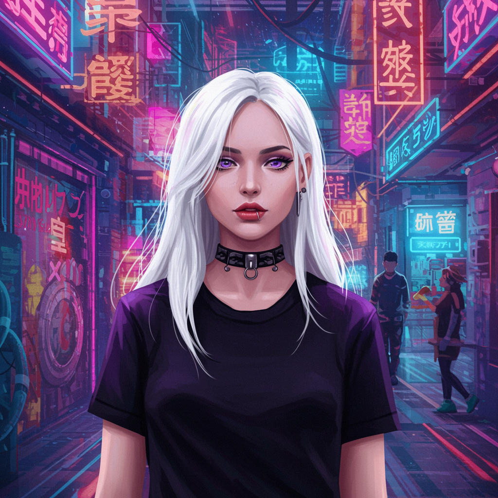 An imaginative portrayal of a woman with striking white hair, adorned in a sleek black t-shirt, depicted in a vibrant fusion of colorful fantasy and cyberpunk influences. The style intricately blends the delicate elegance of Hans Zatzka with the bold lines and dynamic composition of Marvel comics, enhanced by the luminous quality of stained-glass artistry. Inspiration is drawn from Yanjun Cheng's captivating aesthetics, merging with the expansive storytelling of colorful muralists. The scene is lively and immersive, set against a futuristic backdrop teeming with neon lights and intricate details, capturing a sense of wonder and adventure.
