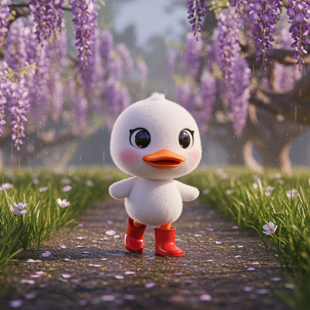 Whimsical adorable 3D character design with a wide shot of a chibi, incredibly cute tiny duck embarking on an adventure in the rain. The scene features stunning scenery with wisteria flowers in full bloom, capturing the essence of springtime. The duck, with its big expressive eyes, is wearing bright red rain boots. This award-winning render boasts a hypermaximalist style with cinematic lighting and intricate details, capturing the heart of the adventure. The atmosphere is lively and playful, with the duck exuding a sense of joy and wonder as it journeys through the enchanting landscape, offering a delightful mix of charm and artistry.