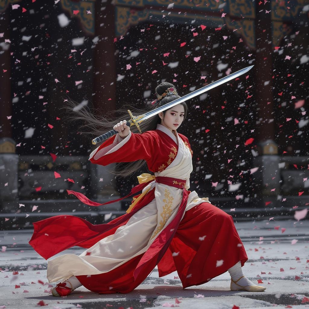 Snow gently falls from the sky, mingling with petals swirling in the breeze, as a 16-year-old Chinese girl, dressed in exquisite Hanfu, expertly wields her sword in the heart of an ancient temple. Her movements are a graceful yet powerful display of martial arts prowess, as she defends herself with precision and elegance. The scene, lit with cinematic brilliance, captures the vibrant tapestry of a Chinese fairy tale, with colorful points of light dancing around her. The setting is meticulously detailed, with dynamic lighting and shadows that add depth and drama to the moment. It's a breathtaking 35mm shot, showcasing the realistic interplay of light and movement, as the girl's focus and determination shine through in this stunning and dramatic portrayal.