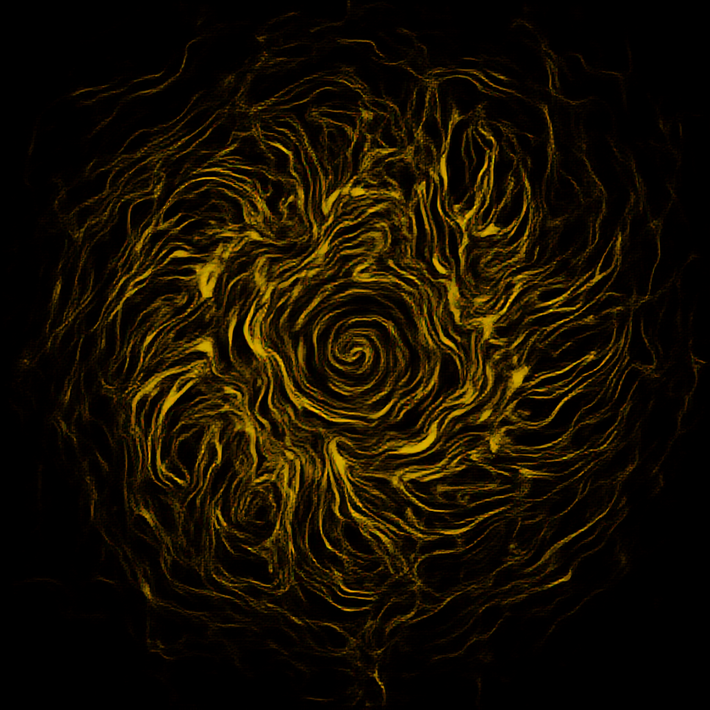 A vibrant abstract design featuring fluid, wavy yellow lines set against a stark black background. These lines emanate from a central focal point in irregular, concentric shapes, evoking a sense of dynamic, organic movement. The style is both bold and graphic, combining a hand-drawn aesthetic with digital precision. Sharp edges and high contrast accentuate the hypnotic, liquid-like energy waves, reminiscent of topographic patterns, creating an engaging and visually compelling composition.