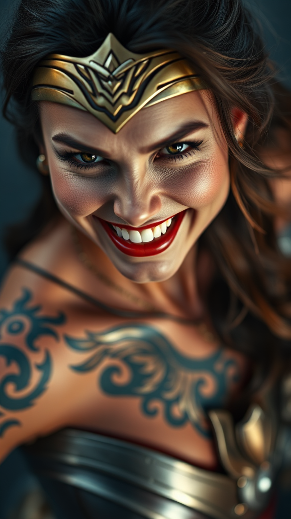 Wonder Woman inspired character, joyful expression, intricate tattoo, metallic fantasy armor, engaging gaze toward the camera, portrait style, realistic photographic representation, 8k resolution, exceptionally detailed, full body composition, vivid RAW colors, expressive piercing, soft diffused lighting, shallow focus depth, sharply defined features, hyperrealistic depiction, cinematic lighting. Avoid elements of low resolution, text, errors, cropping issues, inferior quality, and visual distortions such as jpeg artifacts, duplicates, or anomalies in anatomy. Ensure natural proportions and maintain clarity, avoiding any mutations or deformities, preserving a cohesive and visually appealing outcome.