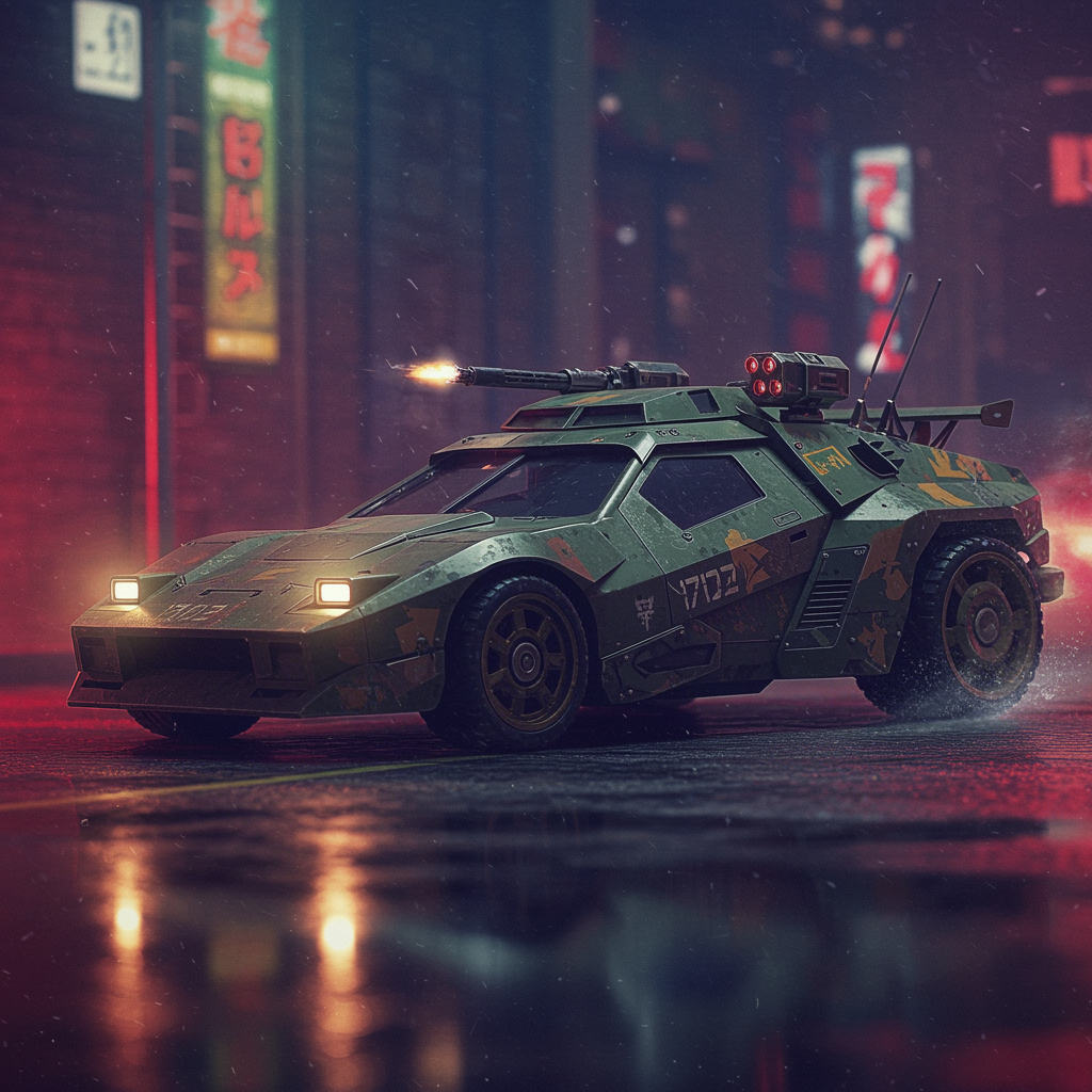 itrobo2022, itrobo2022, futuristic combat vehicle, military-style graphics on the body, full view of the vehicle, powerful cannon, high velocity, movie action sequence, slick wet streets, underground racing vibe, atmospheric darkness, cyberpunk essence, reminiscent of Blade Runner, cinematic appeal, ideal for cover art, detailed look at a battle car, intricate and highly-detailed, digital painting, digital artistry, featured on artstation, conceptual art, smooth and sharply focused illustration, created using affinity photo, available in 4k and 8k resolution.
