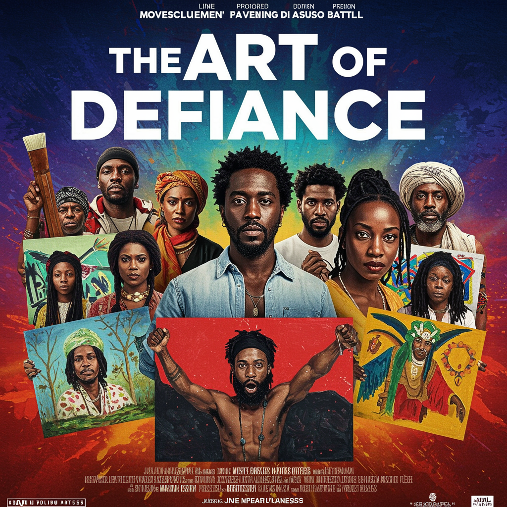 A captivating movie poster for "The Art of Defiance" showcases a diverse assembly of artists and cultural icons, each presenting a distinctive piece of art that embodies their unique movements and battles. The backdrop bursts with vibrant colors, blending elements of abstract and realistic art styles. The poster exudes an exhilarating and uplifting aura, celebrating the strength of art and creativity in overcoming challenges.