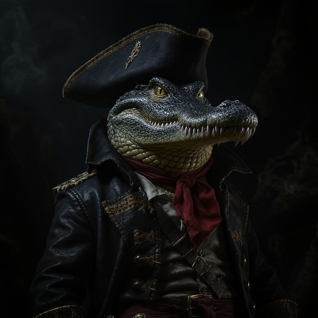 A highly detailed and realistic portrait of an anthropomorphic alligator dressed in 18th-century pirate attire, featuring a distinctive neck tie. The character is designed for a video game, set against a backdrop of dramatic cinematic lighting. The scene employs a rich palette of dark colors, capturing the essence of an HBO production. The alligator's textured skin is meticulously rendered in HD 4K resolution, with shadows and highlights adding depth and intensity. The attire includes a weathered pirate hat and a coat adorned with ornate details, embodying a sense of rugged elegance. Our alligator exudes a commanding presence, with piercing eyes that tell tales of adventures on the high seas, bathed in light that casts a striking contrast against the shadowy background.