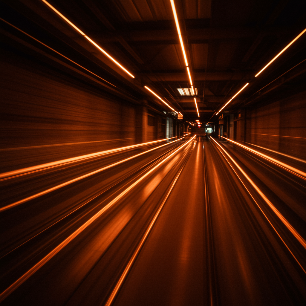 A cinematic abstract image featuring intense motion blur, showcasing rich copper and bronze hues cascading across a dimly lit, atmospheric urban interior. The photo possesses a nostalgic, film-grain texture with gentle luminescence and shadowy borders. The arrangement hints at dynamic movement through luminous trails, capturing a sense of ephemeral elegance and creative impulsiveness. Drawing from vintage photography and contemporary editorial flair.