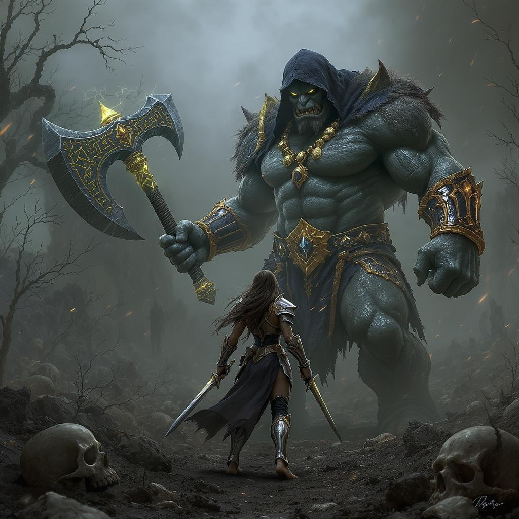 A hyper-realistic scene unfolds in a desolate, mist-shrouded battlefield. A hooded, towering ogre strides forward, wielding a massive cursed axe that glows ominously in the dim light. His path is littered with crushed skeletons, their bones a stark contrast to the dark soil. Adorning his massive arms are golden bracelets intricately engraved with ancient runes, while a heavy jeweled belt and a series of ornate necklaces glint against his broad chest. Facing this formidable beast stands a diminutive yet fierce female warrior. Her feet are bare, yet she exudes an air of indomitable courage. Clad in shimmering, full-body armor that reflects the light of the cursed axe, she stands with her arms outstretched, one hand gripping a finely honed sword, the other a gleaming dagger. The air crackles with tension in this dramatic, cinematic confrontation, as the tiny warrior defies the towering ogre with unwavering resolve.