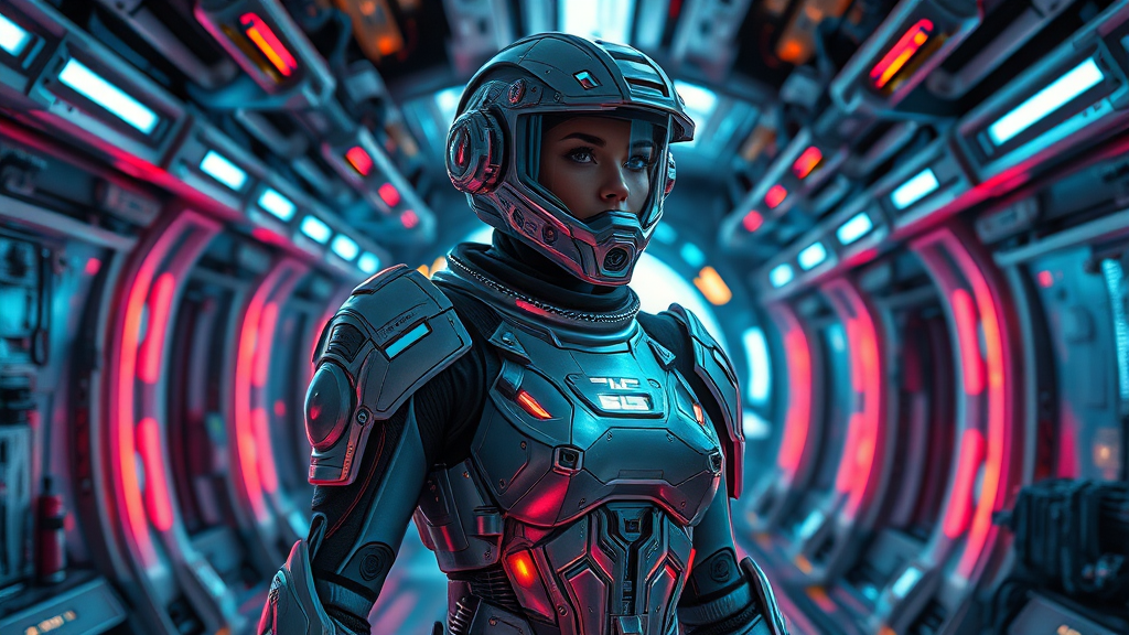 A highly detailed depiction of a female space ranger clad in advanced cybernetic armor, stationed within a futuristic space station. The scene is illuminated by vivid, neon light reflections that dance across the surfaces, underscoring the intricate and complex design of her armor. Her surroundings reflect an otherworldly ambiance with precise reflection mapping, enhancing every element with dramatic and cinematic lighting. The image captures hyperrealistic features and textures, delivering an 8k photorealistic experience that immerses the viewer in this extraordinary interstellar setting. The aspect ratio is vertical, accentuating the towering prowess of the space ranger amidst the sprawling station.