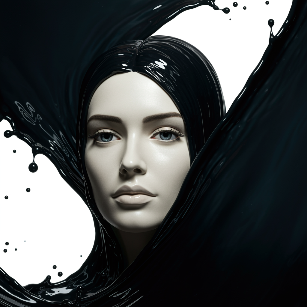 Imagine an unparalleled artistic masterpiece capturing modern simplicity and futuristic elegance, a striking visual testament to stunning imagery and coordinated colors. A surreal, fantasy world emerges, showcasing an artistic close-up of a female supermodel carved from lustrous ceramic. Her deep, expressive eyes gaze forward in a perfectly symmetrical visage, as if sculpted by a visionary. She's enveloped in a silky wave of midnight oil that cascades around her, the dark liquid creating a captivating contrast against her delicate, porcelain complexion. This breathtaking spectacle is bathed in bright, ethereal lighting, channels of light playing across the glossy surface, emphasizing the seamless blend of textures in a dreamlike dance of surrealism and fantasy style.