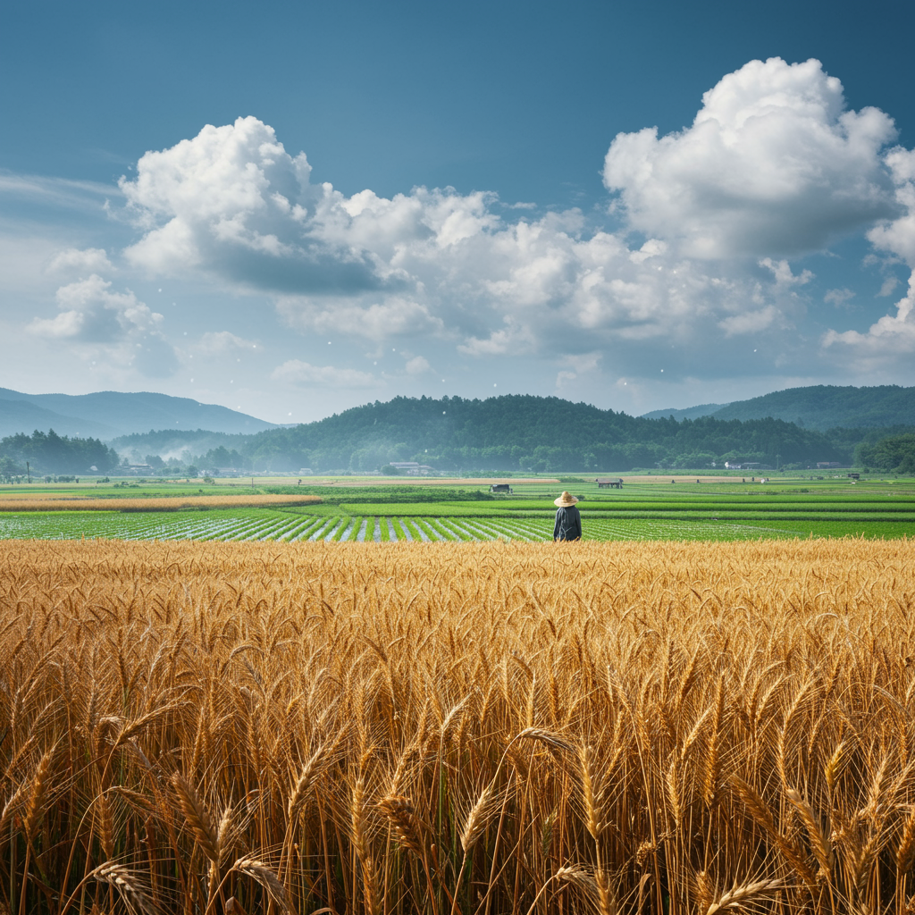 A vast wheat field stretches under a sprawling blue sky, where a farmer with a straw hat stands amidst the golden stalks, big cotton-like clouds floating overhead. Nearby, a lush rice field displays neat rows of vibrant seedlings, each reflecting the tranquility of rural life. Beyond, a serene forest blankets a distant hillside, creating a sense of seclusion and peace. The scene is captured in stunning HD detail, blending hyper-realistic textures with a cinematic, surreal quality. Soft, mystical light bathes the landscape, enhanced by deep field focus bokeh and gentle ray tracing, creating a dreamlike yet vividly detailed tableau.