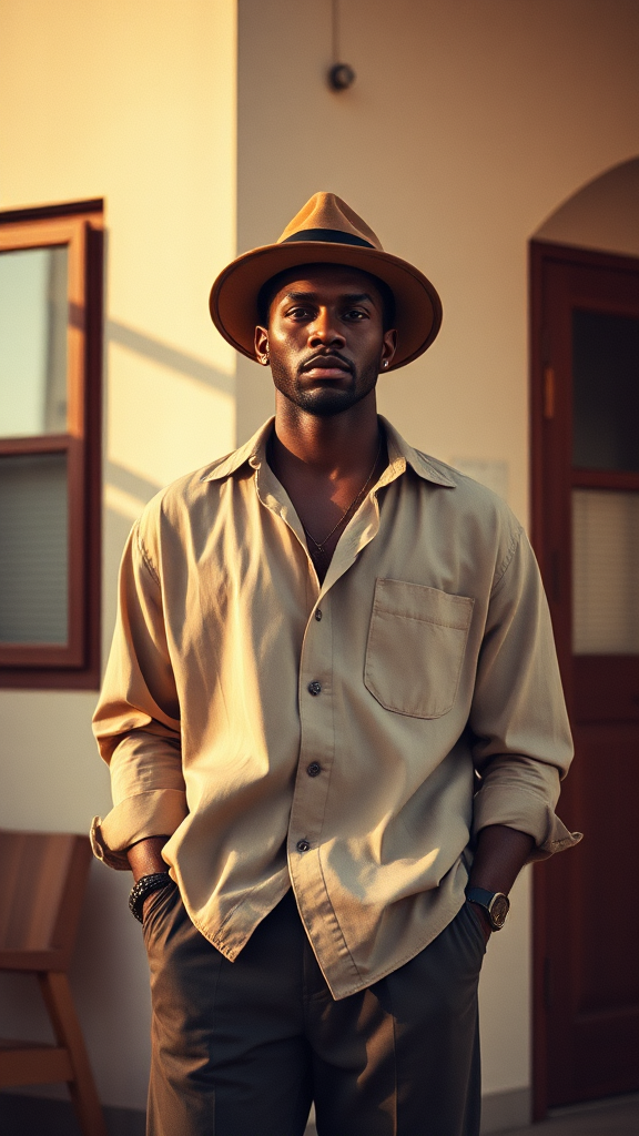 The photograph captures a man in a relaxed pose, his hands casually tucked into his pockets, exuding an effortless cool that draws inspiration from Eugène Brands. Bathed in a retro color palette, reminiscent of the warm hues of summertime, the image evokes a sense of nostalgia. The man, bearing a resemblance to the distinguished Lance Reddick, is clad in loose-fitting apparel accented by a stylish hat, blending contemporary 2020 fashion sensibilities with a nod to 1950s charm. This image, potentially shared on Instagram or crafted for a Dior editorial, mirrors the refined elegance of a Hermes advertisement. It holds the sophistication suitable for a Vogue France profile or lookbook, possibly titled "Gentle Essence."
