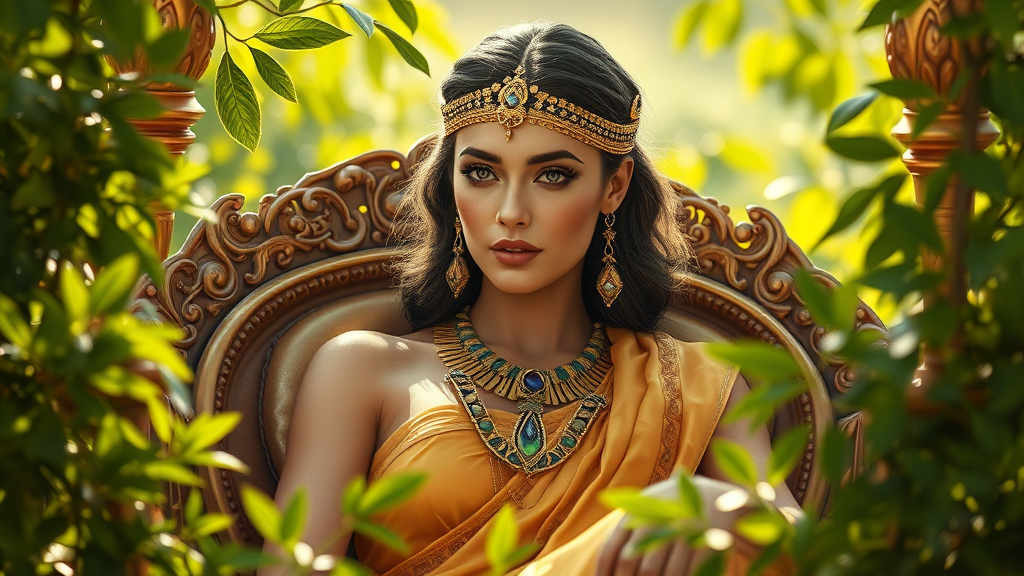 A stunning photorealistic portrayal of Cleopatra, embodying perfection and timeless beauty as she gracefully reclines in a luxurious, ornately crafted chariot. Surrounded by vibrant, lush greenery that blankets the landscape, the scene captures her regal presence. Sunlight gently filters through the leaves, casting a radiant glow on her flawless complexion, accentuating her exquisite features and opulent attire. Her serene expression and dignified posture reflect her commanding yet graceful aura, as the essence of ancient royalty is brought to life in vivid, captivating detail.
