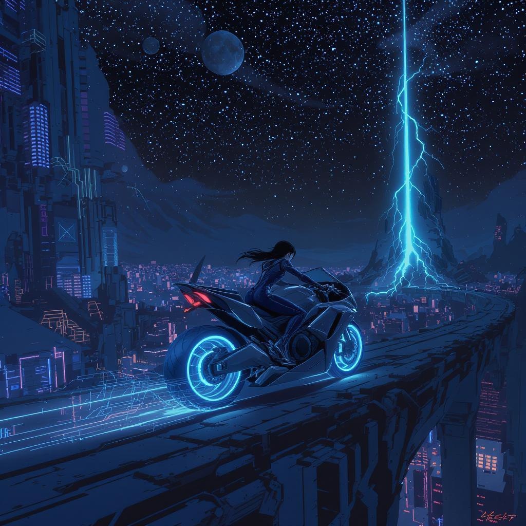 A young woman clad in a sleek, form-fitting sci-fi jumpsuit speeds across a futuristic motorcycle on a colossal, towering bridge. Around her, the remnants of a devastated sci-fi city loom, with gargantuan skyscrapers cascading into darkness. Inspired by the somber intricacies of Tsutomu Nihei's style, the immense structures appear in a staggered, multi-tiered formation, laced with neon-lit power lines. Above, a starry night sky casts a muted glow over the scene, mingled with the soft, eerie luminescence of a blue energy beam streaking across the horizon. The setting exudes a mesmerizing contrast of dark exposure and vibrant highlights. Intricate manga graphics capture every detail in ultra-high definition, with blue neon lights tracing the edges of the girl's silhouette. Her focus remains unwavering as she navigates this dystopian landscape, where futurism and decay collide in breathtaking anime-inspired artistry, delivering unparalleled quality and depth in an 8K, Full-HD portrayal when viewed from the side.