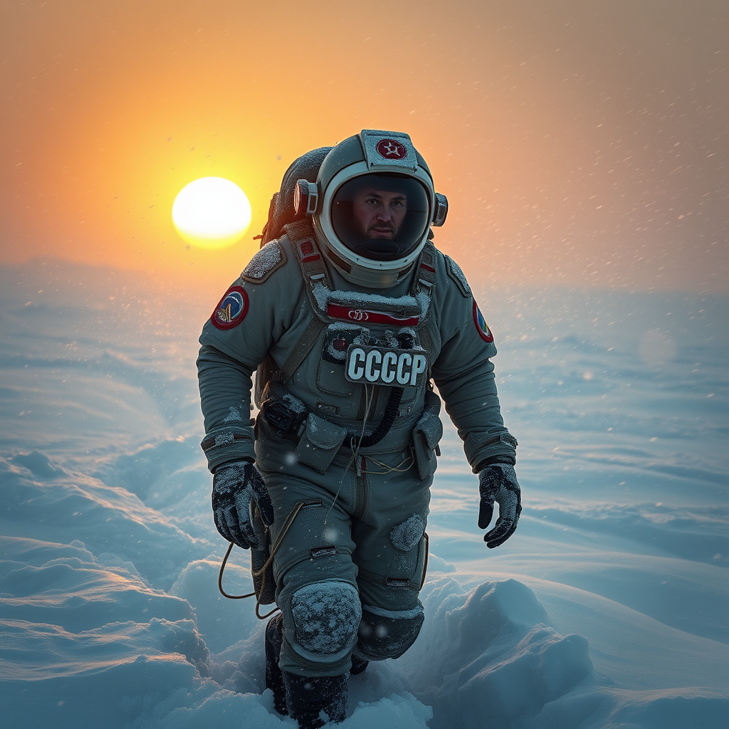 A solitary Soviet arctic explorer trudges through a vicious blizzard, the setting sun valiantly attempting to pierce the howling storm. The explorer is clad in a bulky, retro-futuristic spacesuit, its once-bright red and white accents now dulled and weathered, with the CCCP emblem prominently scrawled across the chest. Frost and ice cling to the suit, battered by relentless Arctic winds, while snow gathers in its crevices. The blizzard rages fiercely, ice particles swirling madly in the air, obscuring all but the vaguest outlines of the landscape and making progression perilous. Whipping snow fills the air, catching the faint, golden light of the descending sun, casting ephemeral beams that struggle to penetrate the storm. Volumes of dim light filter intermittently through the whirling snowflakes, creating ghostly glimmers that momentarily illuminate the scene. Undeterred by the approaching darkness and ferocious weather, the explorer trudges toward a distant nuclear generator, its outline barely discernible beneath the mounting drifts. His steps are plodding and deliberate, as snow piles up around his legs, resisting every movement. The worn spacesuit bears the scars of relentless exposure, with cracks fogging up the visor and visible breath clouding his helmet’s interior. Snow swirls violently around him, capturing the last traces of daylight, while rays of golden light break through the storm to cast a surreal glow over the hostile terrain. Shadows stretch dramatically across the snowy wasteland, though the storm's fury threatens to blot out all light, creating an impression of relentless adversity. Snow and ice adhere to the explorer’s gear, and the sinking sun imbues a sense of urgency, as if precious time is slipping away. The dwindling sunlight interacts with whipping snow, creating a strobe-like dance of light and shadow that shifts and fades as the explorer forges ahead.