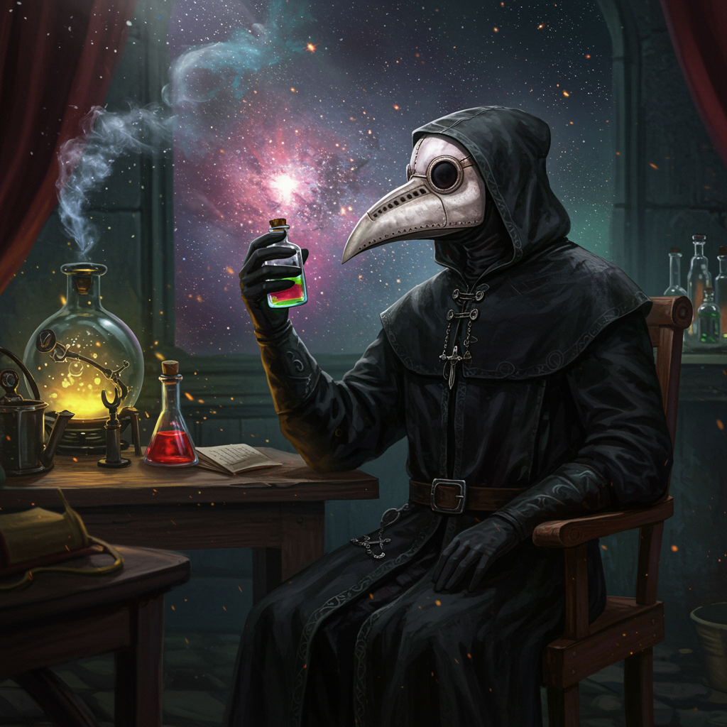 A mesmerizing depiction of a plague doctor seated in an ancient laboratory, grasping a vial of potent elixir, his intricately crafted mask hiding an enigmatic expression. His black robe, adorned with lavish designs and ornate patterns, flows with an air of mystery. The scene is alive with fantasy art elements—a high-definition canvas showcasing breathtaking details. Ambient Occlusion adds depth, while ethereal glowing highlights dance across the setting, casting dramatic shadows. The atmosphere shimmers under Rough texture and shimmer, with Ray Tracing Reflections capturing each nuance. Lumen and Screen Space Reflections create a dynamic, ever-changing landscape, further enhanced by Diffraction Grading. A cosmic supernova subtly illuminates the background, providing a dazzling spectacle. 8k resolution captures every detail with crisp precision, and volumetric lighting bathes the room in an otherworldly glow. The attention to depth and realism transports the viewer to this hauntingly beautiful moment in time, where science and sorcery intertwine seamlessly.