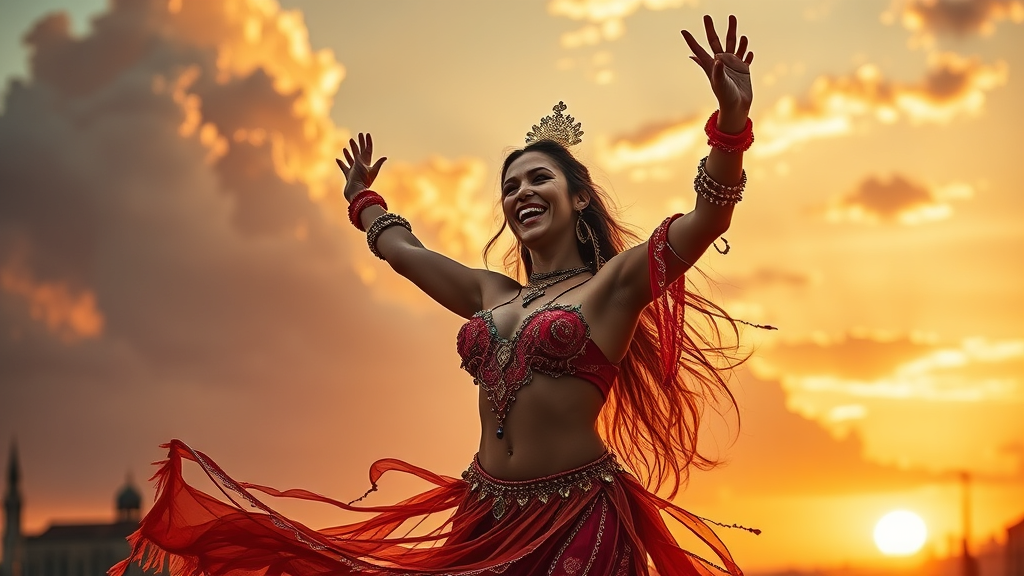 Volumetric lighting, golden sunset, full body portrait of a joyful woman, happily smiling, exuding charm and cuteness, adorned in Venetian carnival attire, engaged in a graceful yet fierce dance reminiscent of a bellydancer warrior, captured in high resolution with hyper-realistic details. The scene evokes the dynamic energy of a painting by Frank Frazetta, with the ethereal clouds reminiscent of the majestic strokes of Albert Bierstadt, all set against a vibrant sunset backdrop, in an oil painting style that blends drama and elegance.