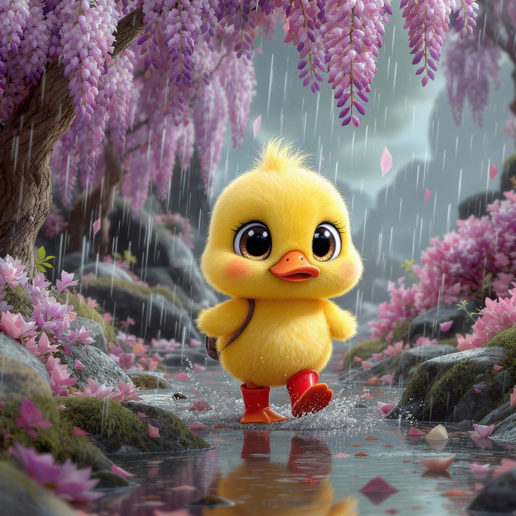 Whimsical enchanting character design 3d octane render, expansive view, chibi irresistibly cute miniature duck embarking on a journey through the rain, stunning landscape, cascading lilac wisteria blooms, springtime atmosphere, bright red rain boots, oversized expressive eyes, prize-winning, hypermaximalist style, octane render, cinematic illumination, intricately detailed, vibrant hues --aspect ratio 16:9 --stylization 1000 --whimsy 30.