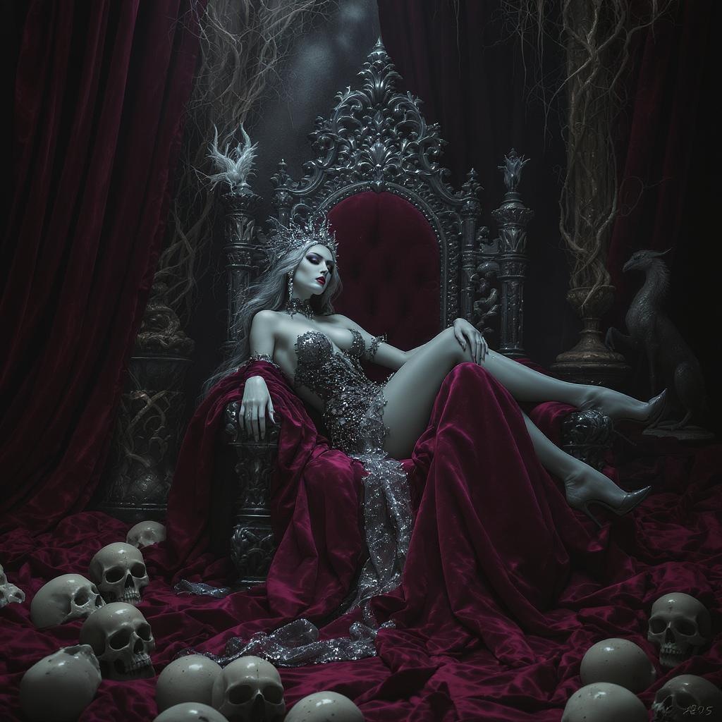 A regal figure reclines gracefully on an ornate throne, surrounded by scattered skulls, their polished surfaces gleaming under the dim light. Her attire is a dramatic blend of dark silver and deep crimson, with flowing fabrics that cascade in elegant curves around her form. The scene is imbued with a sense of dystopian wonder, capturing the essence of apocalypse art. Elements reminiscent of Magali Villeneuve’s intricate designs and Shilin Huang's ethereal style coalesce in the spectral setting. In the foreground, subtle textures and monochromatic tones evoke the spirit of dansaekhwa, while surreal, finely detailed animal forms reminiscent of Adonna Khare's artistry weave subtly through the shadows, merging seamlessly with the haunting atmosphere.
