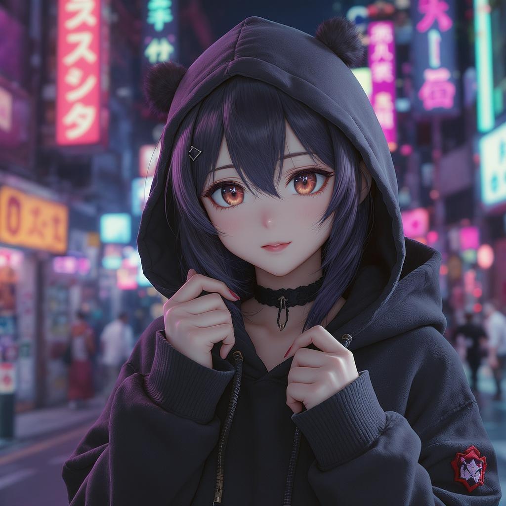 A photorealistic anime girl wearing a stylish hoodie and a choker, set in a neon-lit cyberpunk cityscape. Rendered in exquisite detail, capturing the essence of realistic anime style in 8k. Inspired by the art style of Guweiz, this 3D portrait blends intricate features and vibrant colors, showcasing a captivating character deep in thought. Her expressive eyes and lifelike textures make her stand out as both art and fan art. Perfect for top-rated ArtStation showcases, this detailed portrait epitomizes anime realism in a 4k render.