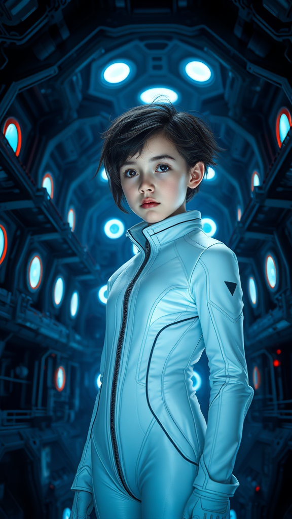 Young girl in a white, sleek sci-fi jumpsuit, styled in Tsutomu Nihei's distinctive manner. Her hair is styled in a [fluttering] manner, set against the cold, metallic interior of a futuristic spaceship. The room is dim, with a gloomy and cold atmosphere, punctuated by blue and bright luminescent lighting from strategic angles. The space exhibits multi-storey architecture with sharp angles, casting deep shadows across its intricately detailed surfaces. A blurred background adds depth to the scene, encapsulating the cyberpunk essence with muted colors. Gigantic elements coexist with intricately small details, infused with hyper detail, clumps of energy, and flashes of light. The girl's expression is stoic, her portrait framed by rounds of illumination and circular design elements. Amidst this futuristic setting, she seems slightly distorted, as if existing in a realm where perceptions are skewed—her form subtly exaggerated in ways that defy conventional anatomy, creating a surreal, almost totem-like presence. The environment, filled with the soft blur of a distant future, envelops her in a narrative of both beauty and alienation.