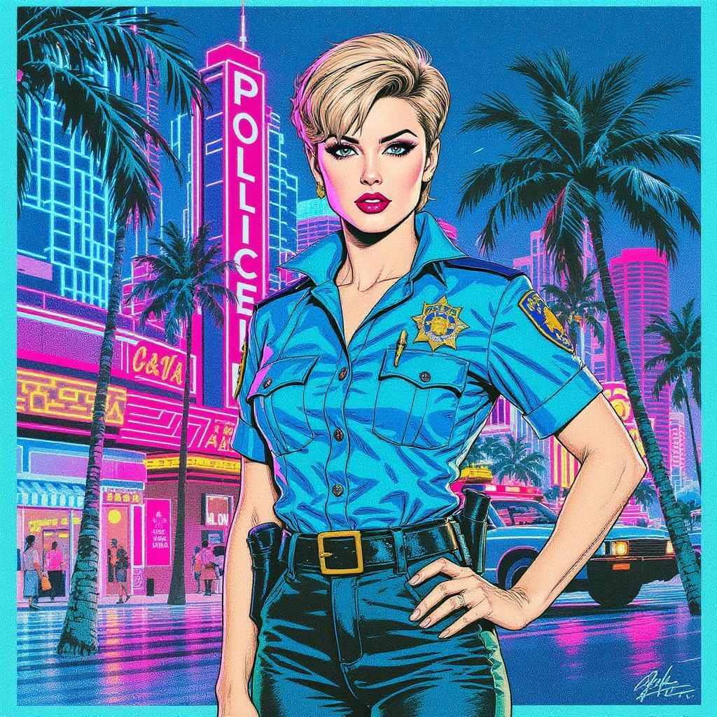 A portrait of an 80's Miami police woman, meticulously crafted and centered, showcasing intricate and highly detailed features. The image captures breathtaking beauty with precise line art and vibrant colors, evoking a comprehensive cinematic feel. Inspired by artists like Guy Denning and Sandra Chevrier, this depiction embodies an 8k HDR quality reminiscent of Vice City's allure. Despite its artistic mastery, the scene presents a few irregularities, such as text errors and occasional missing or extra digits. Certain elements may appear cropped or possess jpeg artifacts. Signature imperfections and features like bad anatomy, extra or missing limbs, poorly drawn hands and feet, along with disfigured or mutated parts, create a surreal yet captivating presence. The artwork might have attributes that are blurry, fuzzy, misshaped, with mutations that add a unique character to the portrait. Watermarks or text may appear subtly within the piece, hinting at an artist's signature while maintaining the core essence of the scene.