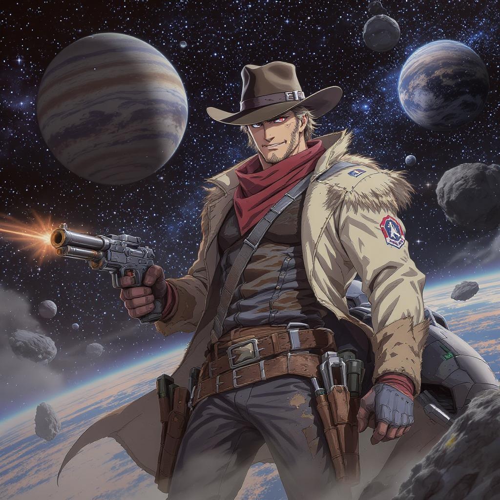 John Wayne as an anime-inspired space cowboy, blending elements of Cowboy Bebop and Trigun, set in a vast cosmic frontier. Wearing a futuristic yet rugged outfit, he navigates the stars with a trusty blaster at his side and a wide-brimmed hat casting a shadow over his determined eyes. His loyal spacecraft is as weathered and relentless as he is, resembling a classic Western steed adapted for interstellar travel. The backdrop features distant planets and asteroid belts, combining the lawless vibe of a Western with cutting-edge sci-fi technology. A gritty yet charismatic aura surrounds him, as he stands against the backdrop of a world where the old West meets the new frontier of space.