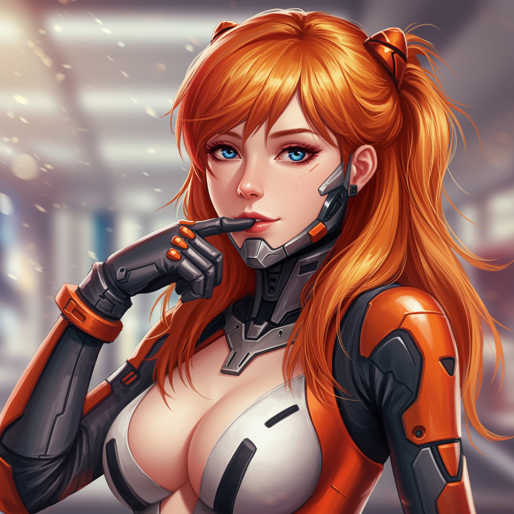A stunningly realistic portrait of Asuka Langley adorned in sleek, futuristic sci-fi armor, exuding a vibrant aura of confidence and power. Her armor is intricately detailed with a metallic sheen, featuring advanced technology and subtle glowing elements, seamlessly blending grace with an edge of modernity. Her striking red hair cascades along the armored shoulders, and her eyes are vivid and expressive, capturing the essence of her dynamic personality. The background complements her presence with a slightly blurred, abstract design, enhancing the focus on her formidable figure.
