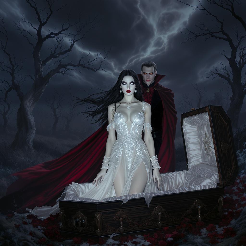 In a wide, panoramic backdrop of a dark, foreboding landscape, a dramatic and eerie scene unfolds. At the center, a female vampire rises from a coffin, her eyes shining with a mysterious intensity. Her porcelain skin glows with an ethereal aura, hinting at her supernatural origins. Dark, lustrous hair cascades down her back, with shimmering highlights capturing the flickering light. She wears a long, flowing gown in shades of white, adorned with delicate silver floral embroidery along the hem and sleeves. The dress is ragged and frayed in places, with sparkling threads that glisten in the darkness. Her lips are a vivid, bold crimson, parted to reveal sharp, elongated canines. A faint, blood-tinted glow dances at the corners of her mouth, and her eyes hold a ravenous, penetrating stare. Behind her, a male vampire stands watchfully, his eyes mirroring her otherworldly gleam. He too possesses a pallid complexion, exuding a spectral charm. His long, flowing hair is a shadowy cascade, with glittering highlights catching every stray beam. Clad in a voluminous dark crimson cloak, intricate patterns are subtly woven along the edges. The cloak is torn in parts, with glimmering threads that reflect the shifting light. His lips, painted with the same bold red, part to reveal formidable, pointed teeth. A soft, crimson luminance tinges the corners of his mouth, and his eyes burn with a consuming, intense gaze. To the left, twisted, gnarly trees rise ominously, their skeletal branches reaching into the turbulent sky. The trees are silhouettes against a backdrop of swirling, tumultuous clouds. To the right, the open coffin rests, its lid ajar to reveal a shadowy, enigmatic interior. Elaborate wooden carvings adorn its surface, lined with silky, white fabric. The scene is steeped in an atmosphere of chilling suspense, as if poised on the brink of some unfathomable, supernatural event.