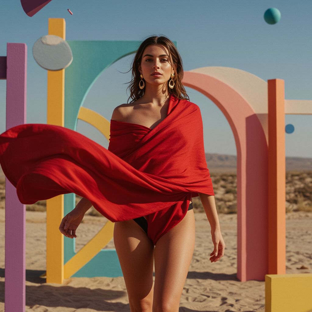 Vibrant photograph of a stunning Instagram fashion model in a crimson wrap, posing amidst colorful geometric shapes, reminiscent of Guy Aroch's style, enhanced by Unreal Engine 5, with touches of Helene Knoop's artistry. The scene is bathed in glowing pastels and bold lines, featuring bright, sun-soaked hues. Captured with a Fujifilm X-T4 and a Sony FE 85mm lens, the image embodies a raw, dynamic style with an aspect ratio of 900:1600 and a saturation of 750.
