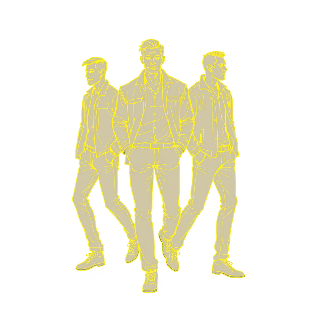 A striking vertical illustration featuring three men sketched with bold yellow outlines, each figure distinct yet harmonious, their poses suggesting movement and energy, set against a contrasting background that enhances the vivid tones and dynamic composition.