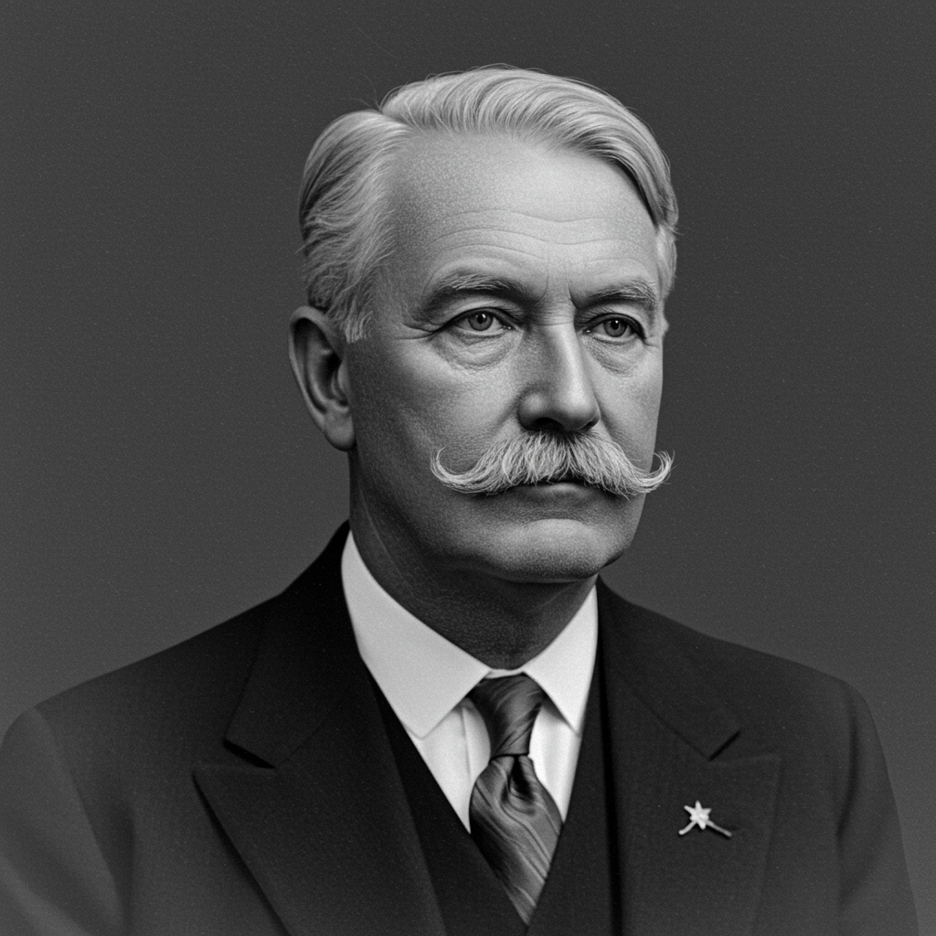 A digital photograph captures a formal portrait of a distinguished middle-aged man, exuding a timeless, photorealistic quality. The image focuses sharply on his face, highlighting every detail with a classic portraiture style. His expression is serious, with a direct, intelligent gaze that suggests deep contemplation. The lighting is soft and even, originating from the front-left, casting gentle highlights on his forehead and cheekbones while creating subtle shadows on the right side of his face, accentuating his features without harshness. The shallow depth of field ensures his face and upper body are in sharp focus, while the blurred background softly fades away, maintaining the subject’s prominence. Rendered in a rich monochromatic palette, the grayscale captures a range of shades—deep blacks in his suit, bright whites in his hair and shirt, and varied mid-grays that add depth and texture to the image. His face is oval, slightly rectangular with a broad forehead, and a prominent jawline. His hair is neatly combed, parted on the left, with a light-colored tone that appears white or very light gray, styled with volume and a slight wave. His almond-shaped eyes are light-colored and deep-set, under medium, straight, light-colored eyebrows. A straight, prominent nose and a thick, well-groomed mustache partially obscure his lips, set firmly. His chin is broad, rounded, with a hint of a cleft. The upper-body pose is formal; he angles right, head turned forward, maintaining an authoritative posture. He wears a dark formal suit jacket over a light shirt, with a dark patterned tie fastened with a decorative pin. A possible dark waistcoat hides beneath the jacket’s folds. The uniform, solid-colored background of medium gray or dark neutral underscores the formal and intellectual mood, evoking dignity, seriousness, and academic authority.