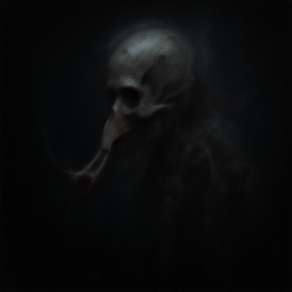 Acrylic painting featuring a smoking skeleton in a side view, employing splatter and drip techniques. The composition is gloomy yet epic, with a dramatic and expressionist style. The close-up digital painting is emotionally profound, inspired by Tanya Shatseva. The scene conveys a morbid and eerie atmosphere, where the skeleton's figure is distorted with elongated limbs and a disproportionate form. Elements like duplicate features, malformed anatomy, and mutations are present, resulting in a blurred and unsettling image. The skeletal portrait has a long neck and missing limbs, creating a sense of surrealism. The background includes jpeg artifacts and signs of low-quality visuals, with hints of text, watermarks, and other distracting elements interspersed throughout the piece.