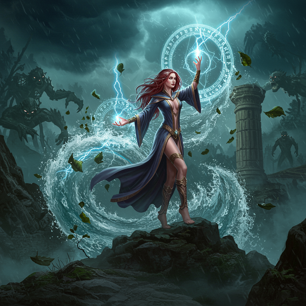 Art inspired by Robert Maguire, featuring a masterpiece of a stunning pinup model in soft lighting with shiny skin. She's adorned in a wizard robe, standing on a windy mountaintop amidst a storm. The scene captures a fantasy wizard casting an enchanting spell, with swirling water enveloping her. Electricity sparks dance around her, and pillars of rock emerge from the earth. A powerful wind sweeps leaves across the scene, and a magical circle glows with runes. In the background, shadowy monsters loom in a dark forest. This dynamic image is in sharp focus, highlighting both the strength and grace of the wizard, her form beautifully integrated into the mystical environment.